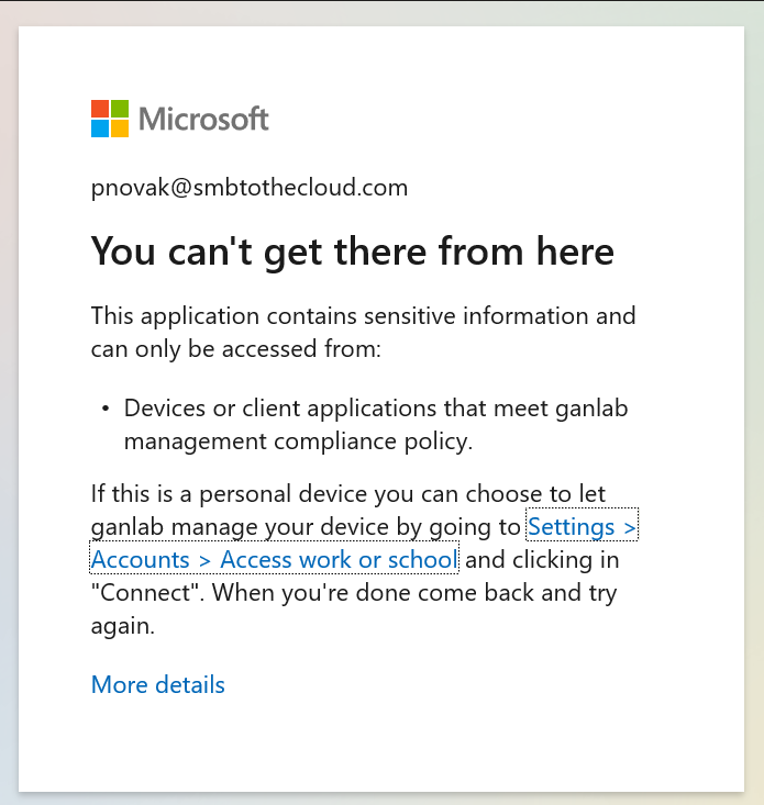 Next time a targeted user tries signing into a desktop app (OneDrive, Word, Outlook, etc.) from an unmanaged Windows device they will be blocked from authenticating and receive the below error: