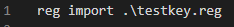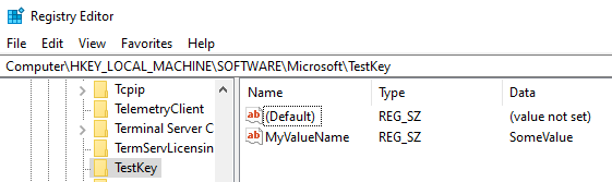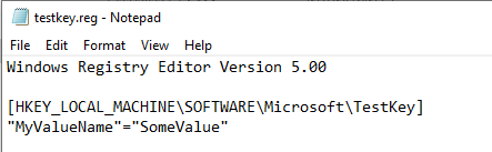 For this example, I want to add a key named “testkey” to HKEY_LOCAL_MACHINE\SOFTWARE\Microsoft. There is more than one way to accomplish this, but I will be using a reg file and importing it with PowerShell. Create your reg file with the keys/values you want to add. Here is my example reg file named testkey.reg: