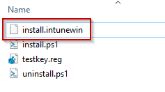 Now that all our files are created, wrap them as a Win32 App using the Win32 content prep tool (https://github.com/Microsoft/Microsoft-Win32-Content-Prep-Tool). Put all three of the files in the same directory. Run the Win32 content prep tool. Specify install.ps1 as the install file and set a destination for your intunewin file. I output it to the same directory: