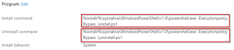 Create your Win32 app in Endpoint Manager and specify our install.intunewin file. Everything here is cookie cutter until we get to the install and uninstall commands. Fill out a name and any other fields you want until you get the install command. When we get here, we need the app to run in 64-bit context. To accomplish this, we use the hidden “sysnative” path. This will use the native OS architecture to open 64-bit PowerShell. Reading the two links above will shed some more light on this. You must use the sysnative path or this will not work. So, our install and uninstall commands look like this. Make sure you select System for the install behavior.