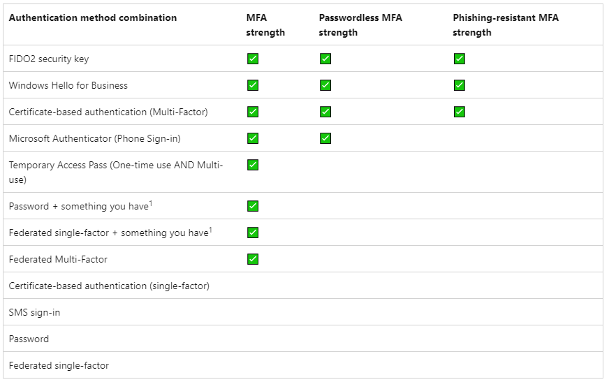 A table from the above link is shown here with the authentication methods and their MFA strength: