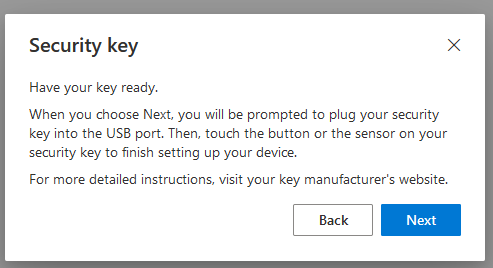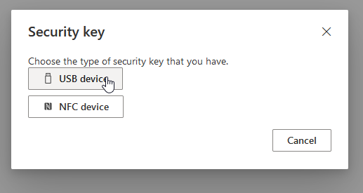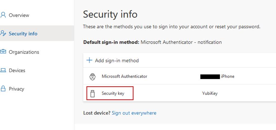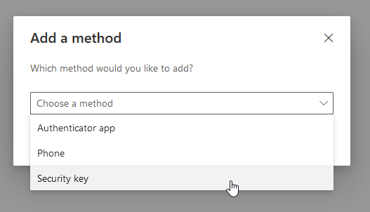 Click Add sign-in method and select security key. I’ll be using a YubiKey 5 device.