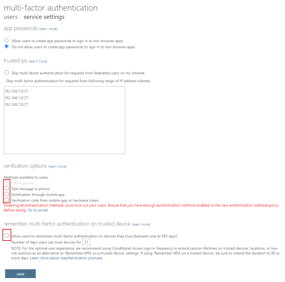 Here is a screenshot of the service settings with the options unchecked. We will configure these options under the new Authentication Methods Policies: