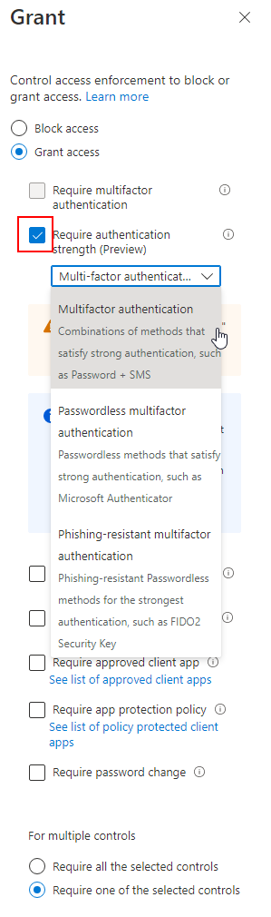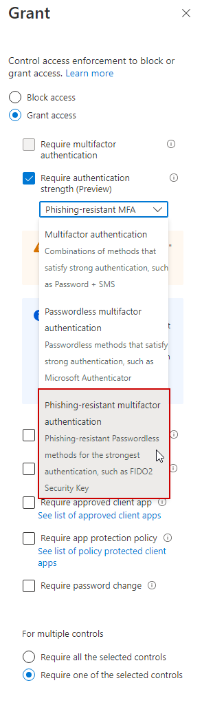 Next, we create our grant control to use authentication strength, and select Phishing-Resistant MFA, which requires a security key, WHfB, or certificate based auth: