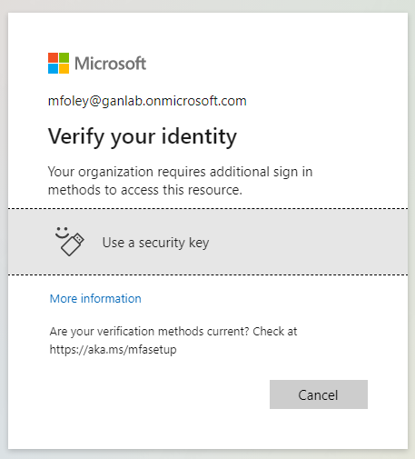 If we try to sign directly into teams, or if we try accessing teams through the web app, we will be forced to authenticate with our FIDO2 security Key. Note that the current sign in was authenticated with the authenticator app, but since this specific app requires stronger authentication, we will be required to provide the security key when opening the app.