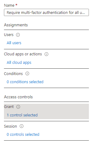 This applies to all my users in my dev tenant. If you want to use a break glass account with a long complex password, you can exclude it from this policy. I’ll be applying this to all users and all apps: