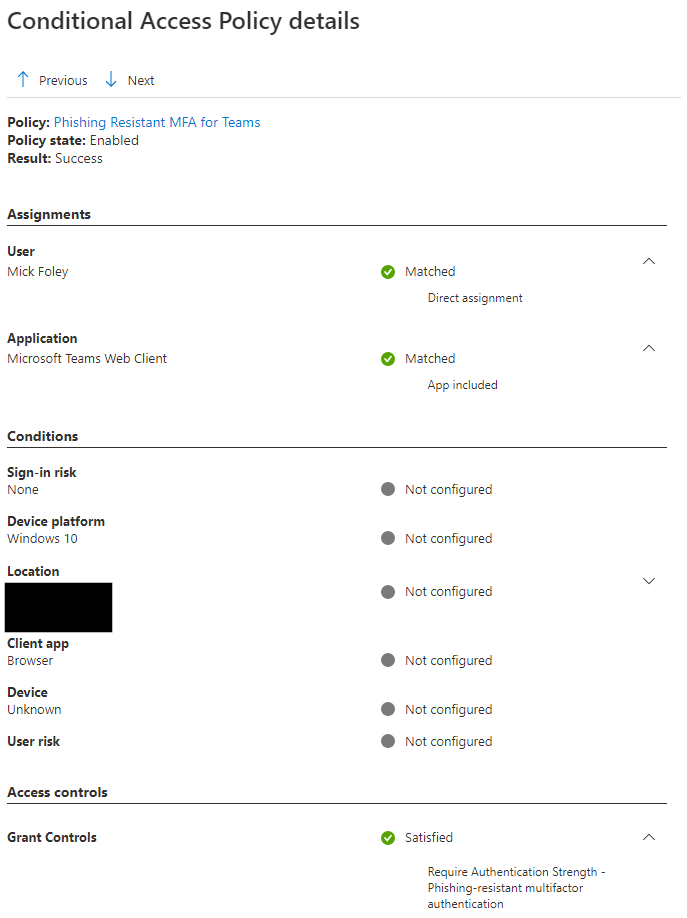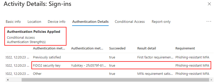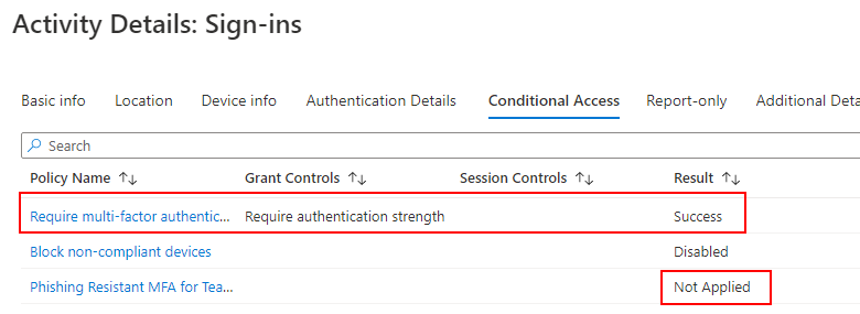 Let’s look at the sign-in logs and see how they display for the sign-ins. Here is the sign-in to the Teams Web client, which requires phishing resistant MFA: