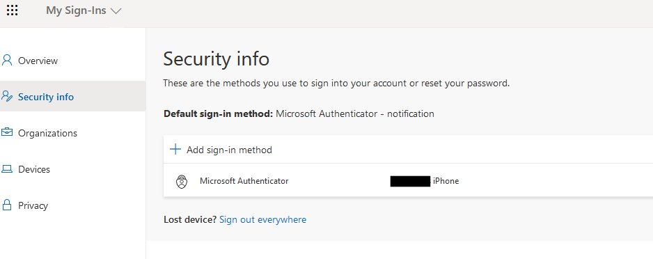 FIDO2 security keys are among the strongest authentication methods available, and are identified by Microsoft as Phishing Resistant (WHfB and Certtificate Based authentication are the other phishing resistant methods). Users can add methods from mysignins.microsoft.com under the security tab. Currently, this account only has the authenticator as a sign in method: