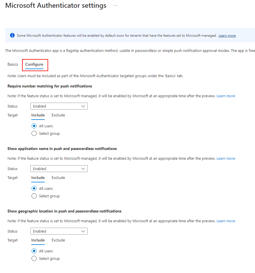 Clicking on one of the methods will give you additional options. For Example, if we select the Microsoft Authenticator Method, and navigate to the configure Tab, we can configure the authenticator behavior. You have three options – Enabled, Disabled, or Microsoft Managed. Enabling will force the feature to be turned on. Microsoft managed will let Microsoft enable the features over time in the tenant. I chose to enable these settings for all users: