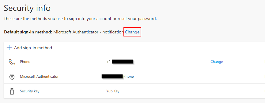 Since we are also allowing SMS, we can Add another sign-in method and select phone to add SMS. SMS is better than nothing, but I recommend against using SMS. If you’re currently using it, try transitioning users to the Authenticator App. After adding more methods, you can change the default method if you’d like: