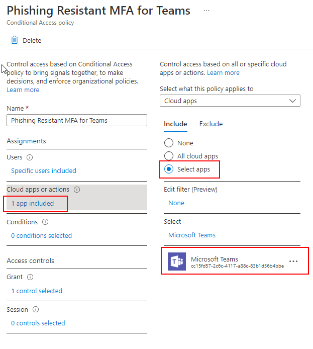 Next, we will configure the policy which requires stronger authentication for a specific app. We will use Teams in this example, and only apply it to specific users. I have this applied to my test user and we select Teams as an included app:
