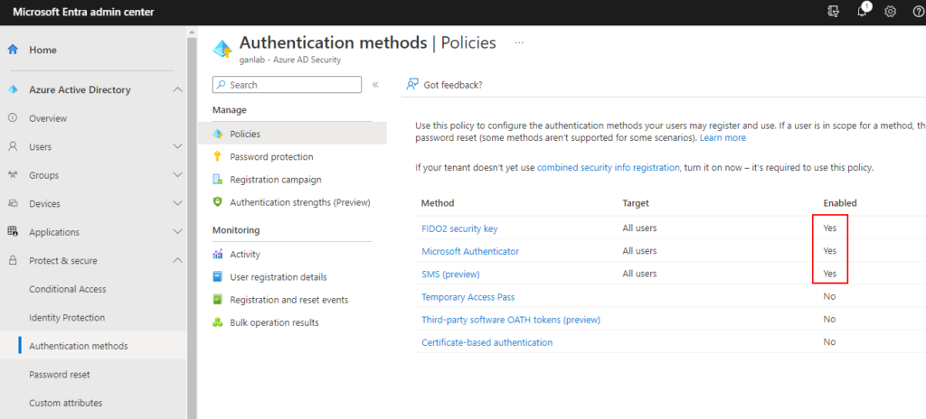 Sign into entra.microsoft.com and navigate to Protect & Secure > Authentication Methods. Here is where we can enable the authentication methods we want to use for MFA. In this example, I will enable FIDO2 security Keys, the MS Authenticator App, and SMS for all users. You can enable specific methods for a subset of users if you need to.