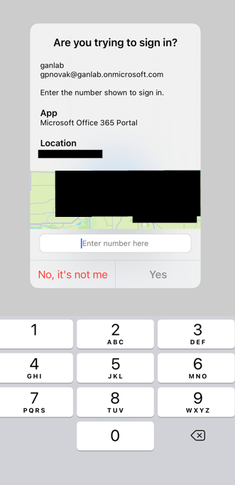 An Example of how this looks when someone signs in using authenticator can be seen below. We see the geographic location, app name, and we are required to type the number shown on the device signing in. This makes users think instead of blindly accepting a push request:
