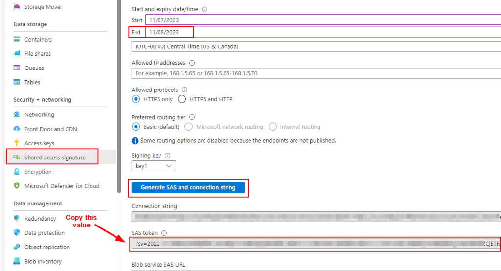 Next, we need to generate a Shared Access Signature for our source and destination storage accounts. Select each storage account, and under Security + Networking, select Shared access signature. Add an expiration date for the SAS, select the proper permissions for the file services, and configure an allowed IP address if you’d like. Leaving that field blank will allow it to be used from Any IP. Click the generate SAS and connection string button, and copy the SAS Token: