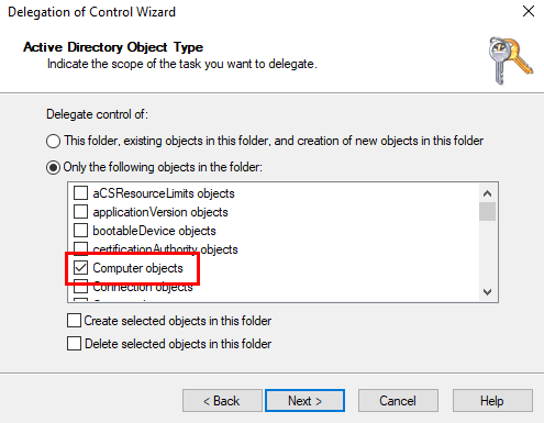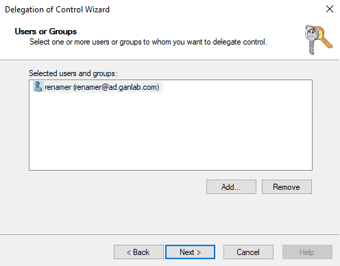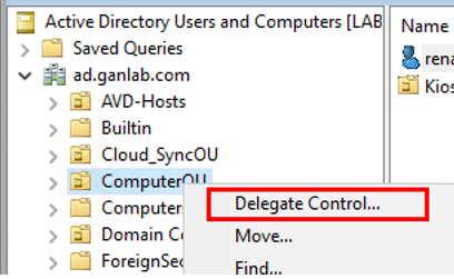 To start, I created a domain account named renamer. If you end up going this route in production, take extra security measures to lock this account down as much as you can. Provide a complex password, prevent interactive logins, etc. Next, we need to provide this account with some additional permissions to allow the renaming of devices. Right-click on the OU where your hybrid devices will be joined to the domain, and select delegate control: