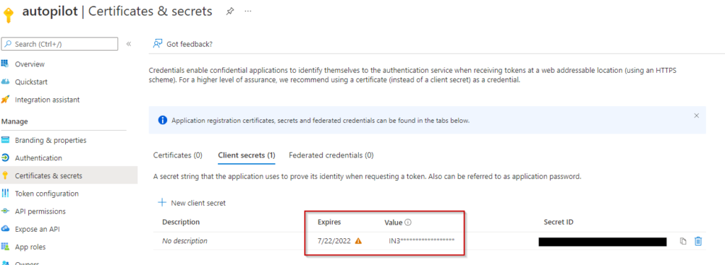 - Make sure you save the secret key for the app registration. You won’t be able to retrieve it again, but you can always make another one if needed.
