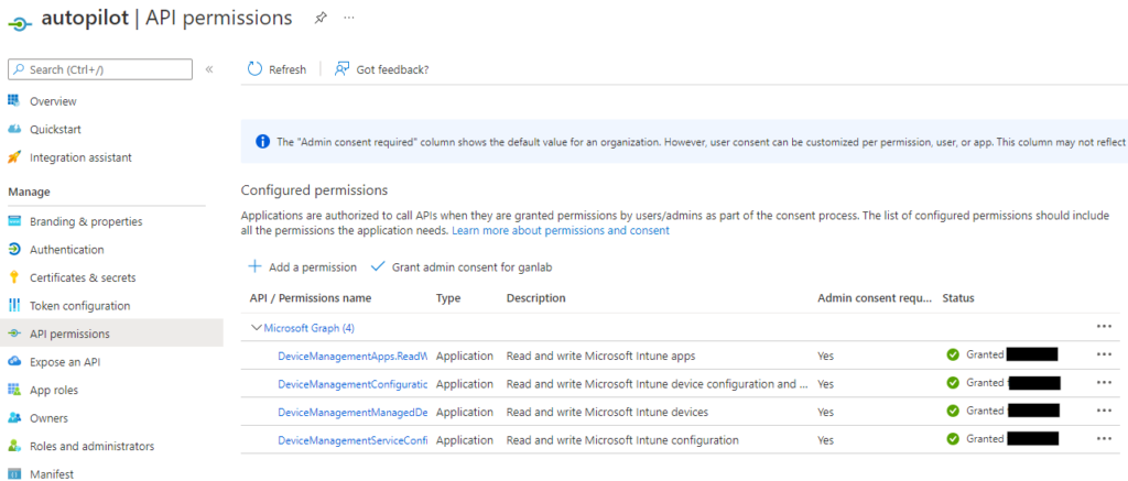 Getting devices registered in autopilot can be a pain if they are already in production. I wrote a post last month about uploading hardware hashes to blob storage (or a network share) and then merging the CSV hashes into a single file for upload. However, I recently discovered the Get-WindowsAutoPilotInfo script can authenticate to your target tenant using an app registration. So, I started doing some testing and created a new AzureAD app registration. Next, I did some reading on the Graph application permissions for Intune. After some trial and error, and some testing, I found I needed the following Graph API permissions assigned to my app to enroll a device and assign a grouptag (this may be different if you use other switches):