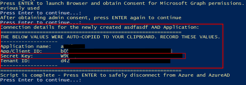 - Outputs the Application name, AppID, Secret Key, and Tenant ID, and auto copies those values to the clipboard