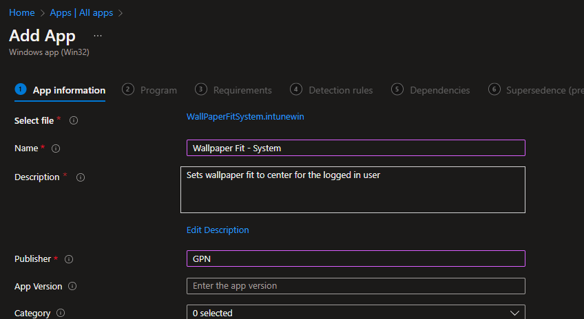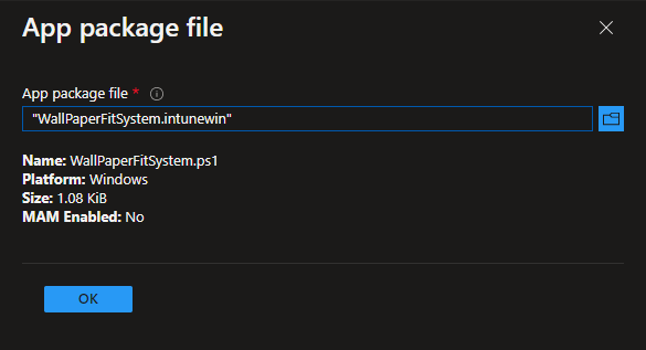 We create the Win32 app the same way we create any other Win32 App. The exact scripts I used in this blog are available on my Github here. First, package your install and uninstall scripts as an .intunewin file. My install script is named wallpaperfitsystem.ps1. Create a new Win32 app and upload the .intunewin file: