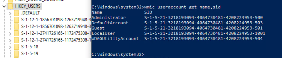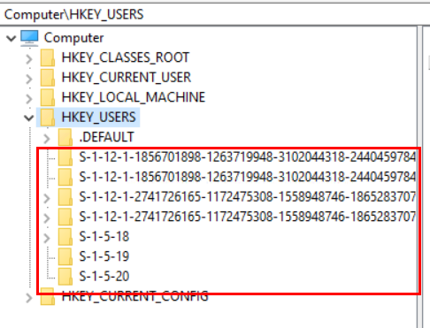 The challenge was running as system, but identifying the SID of the signed in standard user. With Azure AD users, they don’t have a local user account presence. So, regular commands like wmic useraccount get name,sid don’t return Azure AD users. Although there are other methods to get their SID of a signed in user, most of them involve some sort of manual intervention. In this case we need the script to execute on its own with no user or admin interaction. You can see below how some user SIDs in the registry begin with S-1-12, which means they are Azure AD user, and our local user SIDs don’t show Azure AD users: