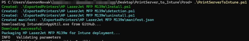 Next, the printer driver and connection information are gathered, install, uninstall, and detection scripts are generated, and the printer and driver are packaged for deployment as a Win32 app. You’ll get PowerShell output for the files/folders created and for whether the printer was successfully packaged. Only printer drivers that contain an infpath value from Get-PrinterDriver in PowerShell will be exported (the 64-bit driver), which should be the vast majority of printers. This also means that integrated Microsoft Printers (PrintToPDF, OneNote, etc.) will also be skipped. A log will be generated and stored in the logs directory for any skipped printers, including the reason why it was skipped.