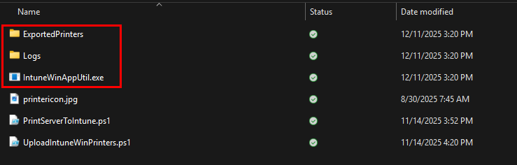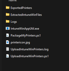 And in the same directory where the script is, there will be folders created for ExportedPrinters and Logs, and the IntuneWinAppUtil.exe