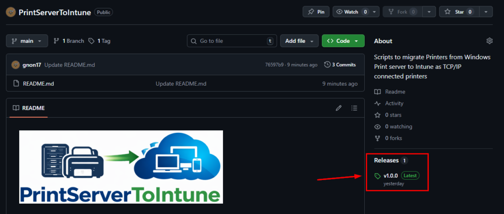 The script needs to be executed on the server/workstation where the printers are connected directly by TCP/IP port. If you don’t have a print server, you could connect all the printers to a workstation (via IP port) and then run the script from there. The printers do not need to be shared, but they must be connected to the workstation/server where you run the script, and they must be connected via TCP/IP port. Go to GitHub (https://github.com/gnon17/PrintServerToIntune) and download the latest release: