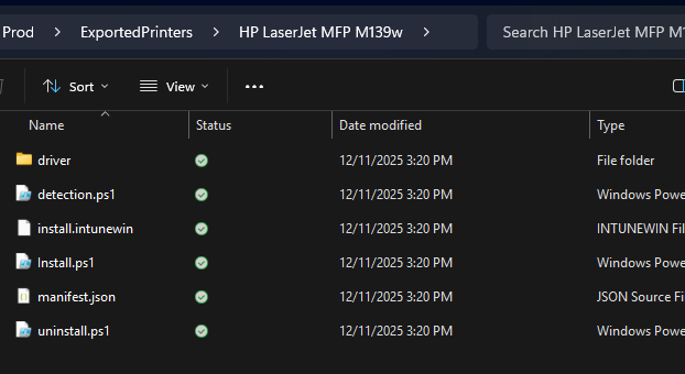- Generated by the packagemyprinters script. Each selected printer will have a subfolder with the name of the printers, the Intune install script, uninstall script, detection script, a manifest, driver folder containing the driver files, and the packaged install.intunewin file for a Win32 App.