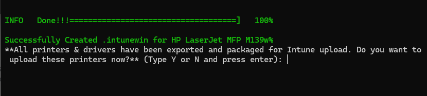 When the script finishes exporting and packaging all your selected printers, it will prompt you and ask if you want to upload the printers to Intune. If for some reason you didn’t want to do this, you can enter N and then run UploadIntuneWinPrinters.ps1 later, but we will enter Y and proceed to the upload portion.