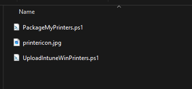 - PackageMyPrinters – Run this first. It pulls the printer info, generates install, uninstall, and detection scripts, and creates the .intunewin files. All folders and files generated/downloaded by this script will be placed in the working directory of the script. If the printer is shared, the name in Intune will be the Share Name. If it’s not shared, it will fall back to the printer name in Windows.