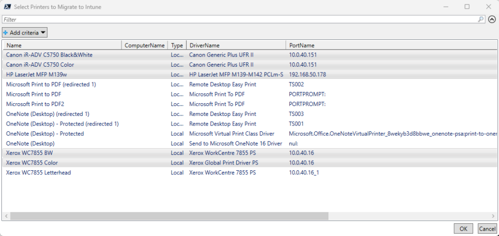 Before starting, If you don’t want the Publisher of the Win32 to be SMBtotheCloud, as it shows in the company portal image earlier in this post, edit line 169 of the uploadintunewinprinters script. Launch PackageMyPrinters.ps1 Select the printers you want to package (Ctrl-click to multi-select) and click OK: