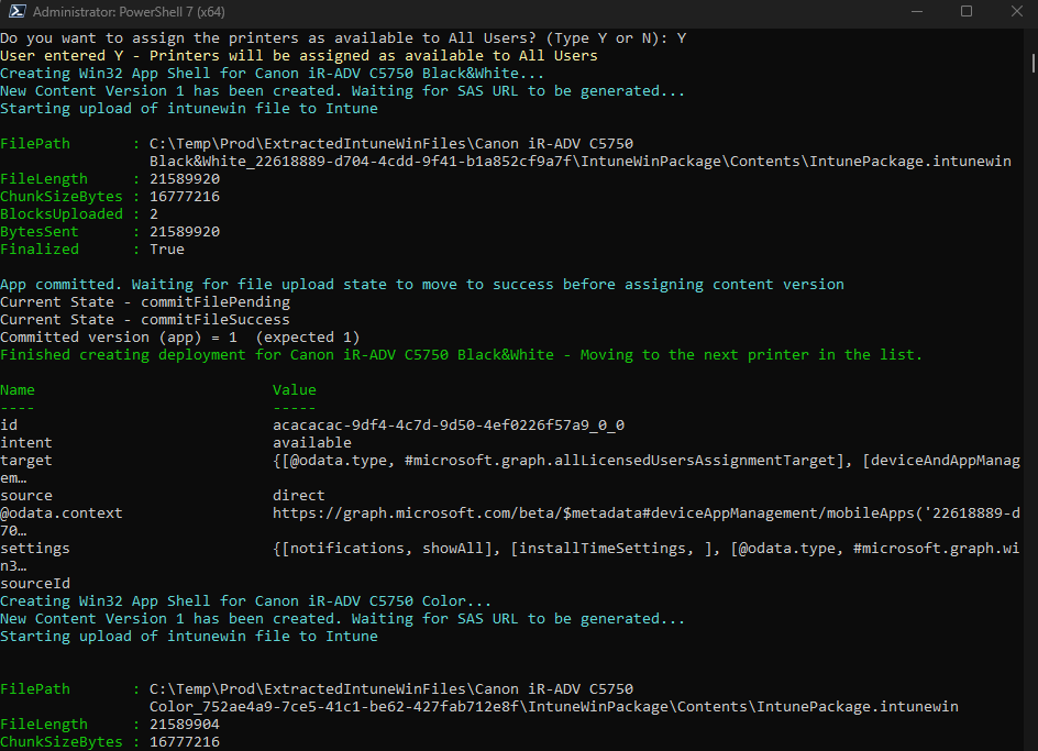 - The second script (UploadIntuneWinPrinters.ps1) will create an Intune Win32 app for each printer that was exported and upload the intunewin files. You’ll also be prompted at the start of the script if you want to assign the uploaded printers to the All Users group to save you time on the assignments if the organization wants to allow all users to freely connect to printers via company portal.