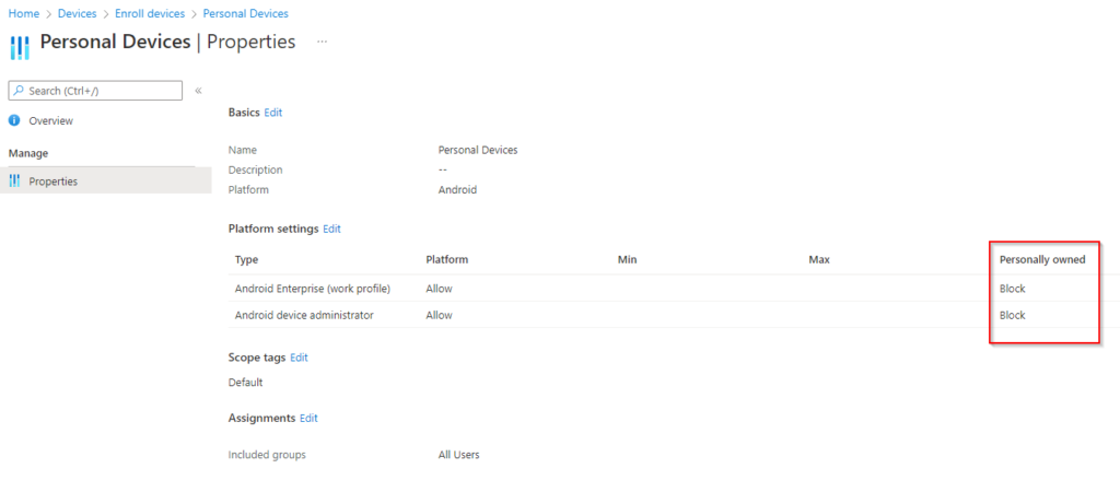 Before we create the policies, if you want to prevent users from enrolling their personal devices in MDM, we can make a device enrollment restriction for personally owned Android/iOS devices. Navigate to Devices > Enroll Devices > Enrollment device platform restrictions. Create an Android and iOS policy to block enrollment of personally owned devices: