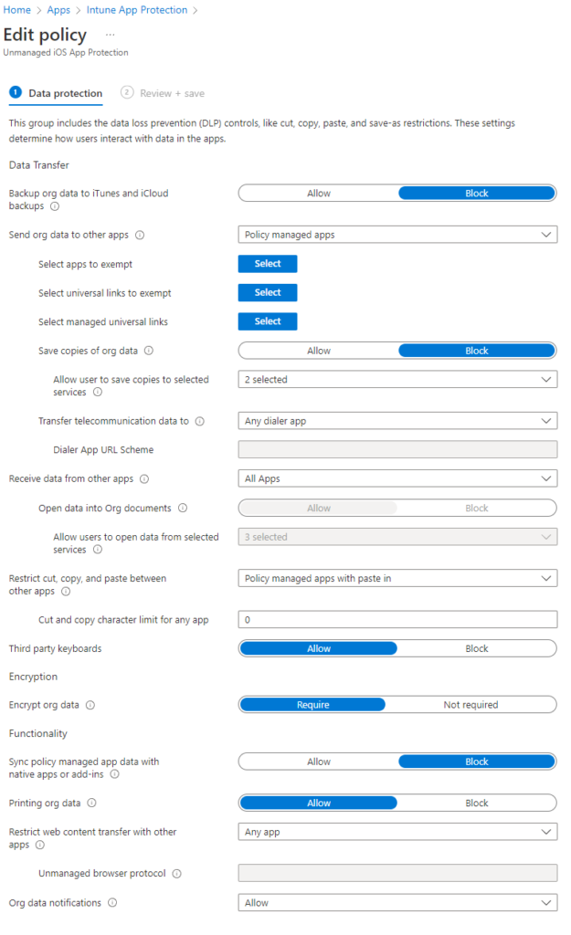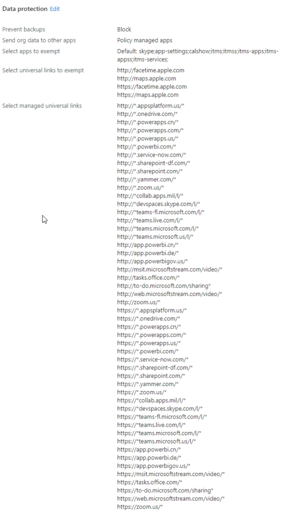 Here are the equivalent iOS policy settings. The defaults are left for the selected apps to exempted and managed apps/links:
