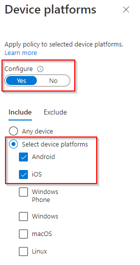 In the conditions tab, we need to set the device platforms to Android and iOS: