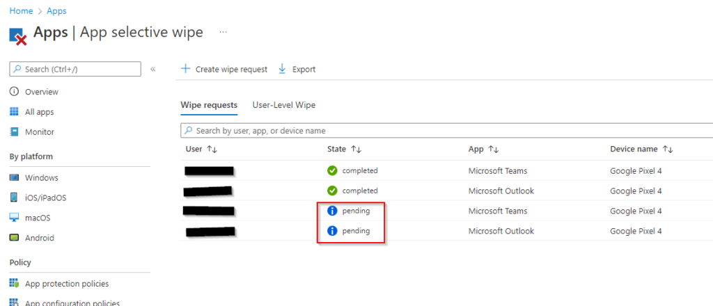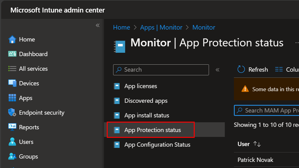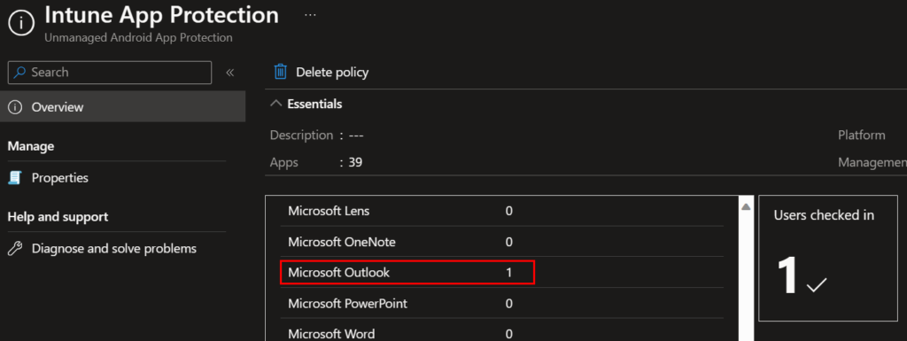 You can grab a quick overview of the number of users that have the App Protection policy applied from the App Protection Policy overview page. Although, this is not very useful since you can’t see specific users. You only get a count: