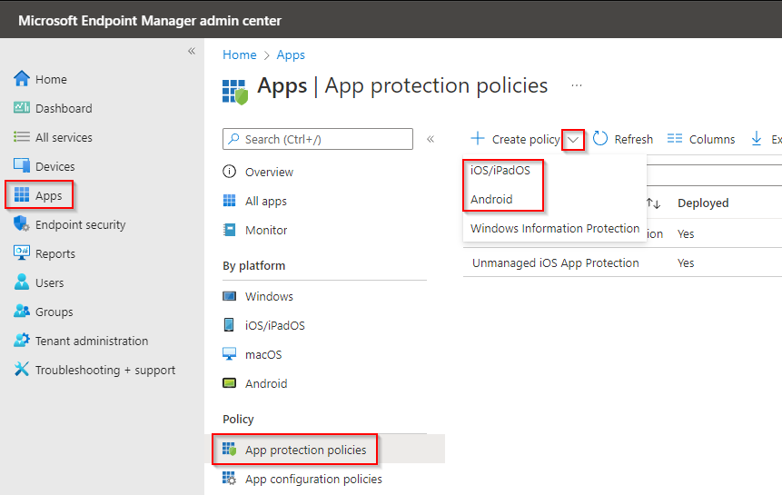 Now we will create our app protection policy. This is the policy that can control how company data is handled within approved applications. In Intune, navigate to Apps > App protection policies. Click create policy, and select iOS or Android. For this post, I’ll chose Android, but the settings are almost identical: