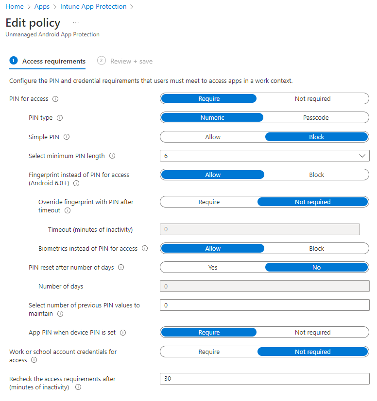 Next, we need to configure access requirements. These are the settings used to allow access to the app containing the company data. It is good practice to require a PIN so we can ensure that even if a user does not have a passcode on their personal device, accessing the Apps containing the company data will require a passcode. This can be overridden with a biometric if they have a biometric unlock on their device.