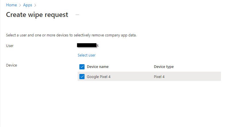 Select the user, and any associated user devices will show under Device. Select the device you want to wipe the company data from. Click create after the device is selected.