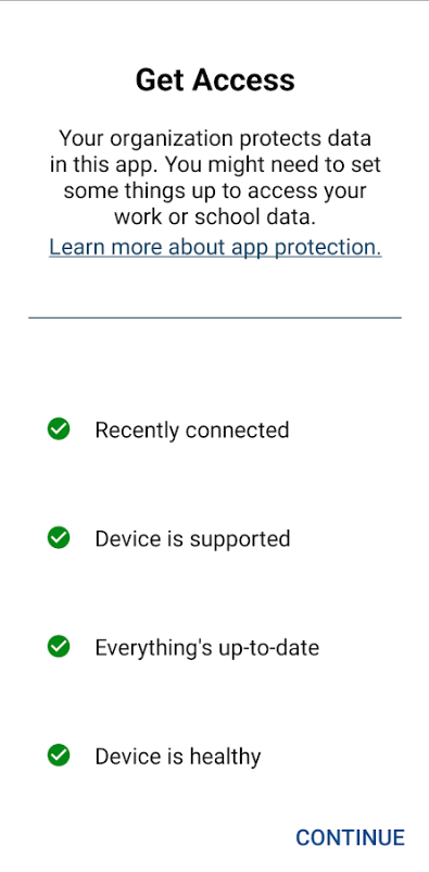 A screen like the one below will show up next informing the user that the organization is protecting data in this app. Tap continue: