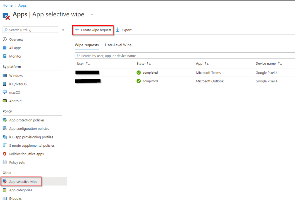 In MEM, navigate to Apps > App selective wipe > Create wipe request: