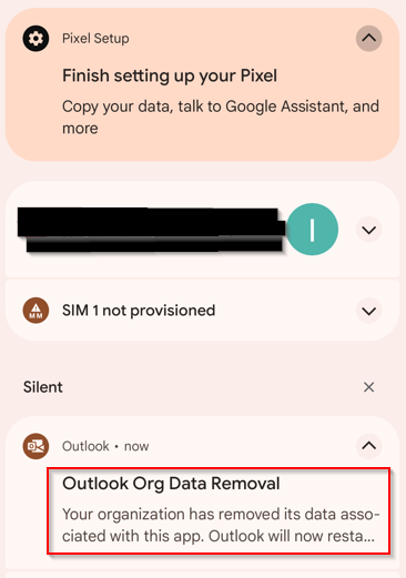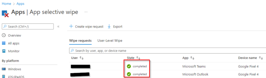 When the data is wiped from the device, the account is removed from the app, and the user will receive a notification on their device that the organization data has been removed. The wipe request will then show as complete in MEM: