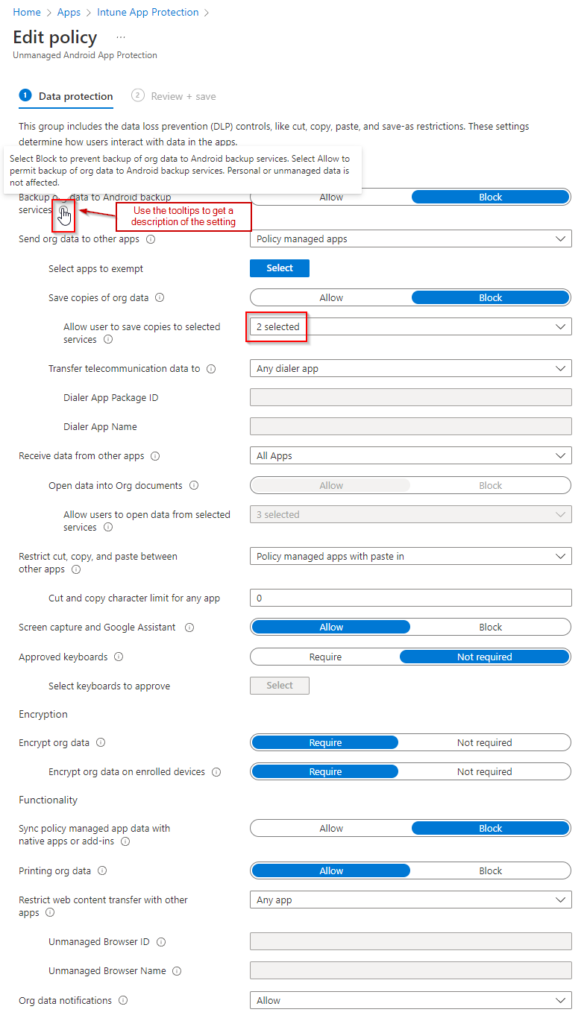 The data protection settings allow us to control how data is managed within the targeted applications. This includes things like allowing copy/paste, printing org data, and saving copies of data. You can set these how you want, but the below image is a good template you can start with. The tooltips next to the settings give a good description if you are unfamiliar. The two selected apps that allow users to save copies of data are SharePoint and OneDrive.
