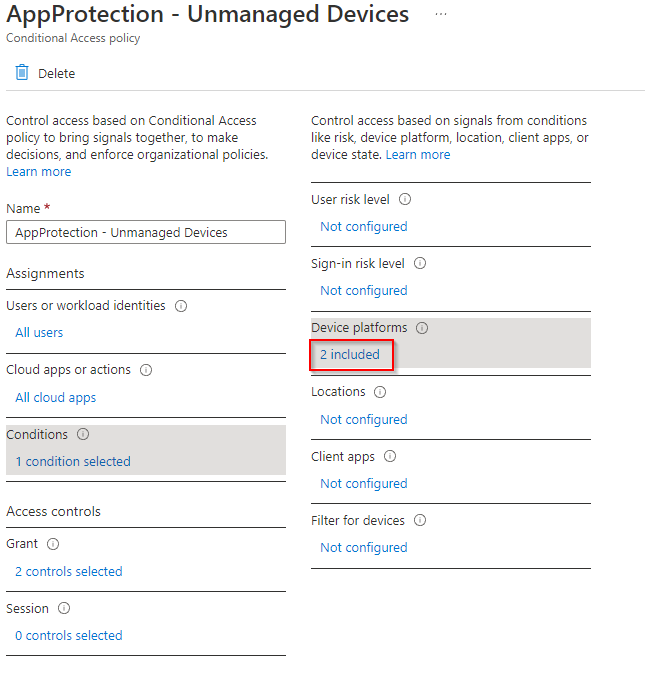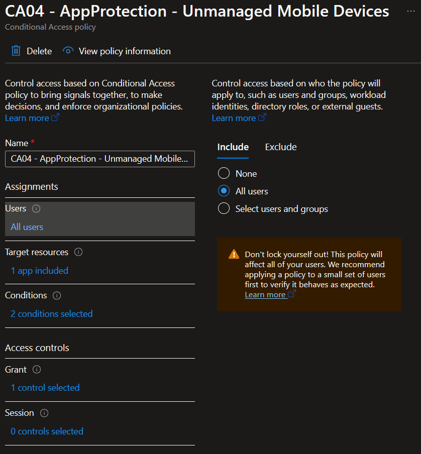 That completes the App Protection Policy portion. Now we need to make a Conditional Access Policy to enforce our App Protection Policy: