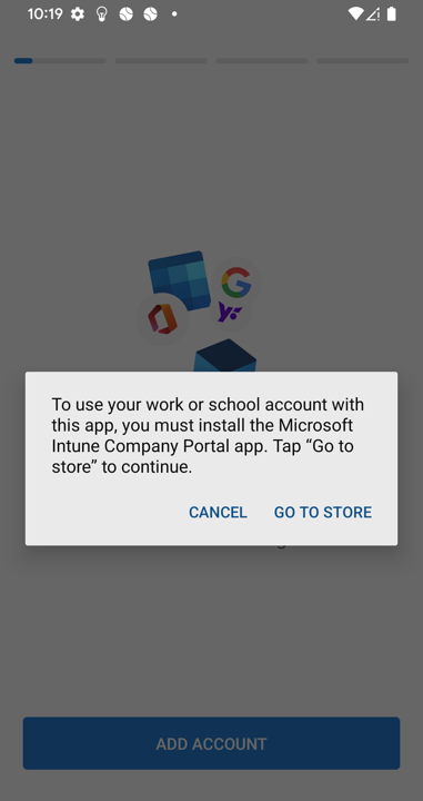 When the device registration completes, you will be notified that you need to install the Company Portal app to continue (unless its already installed). If the user was previously signed into the Outlook app before the MAM policies were applied, this is what they will receive the first time they open the Outlook app. Tap go to store: