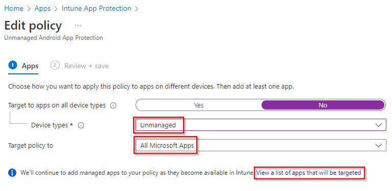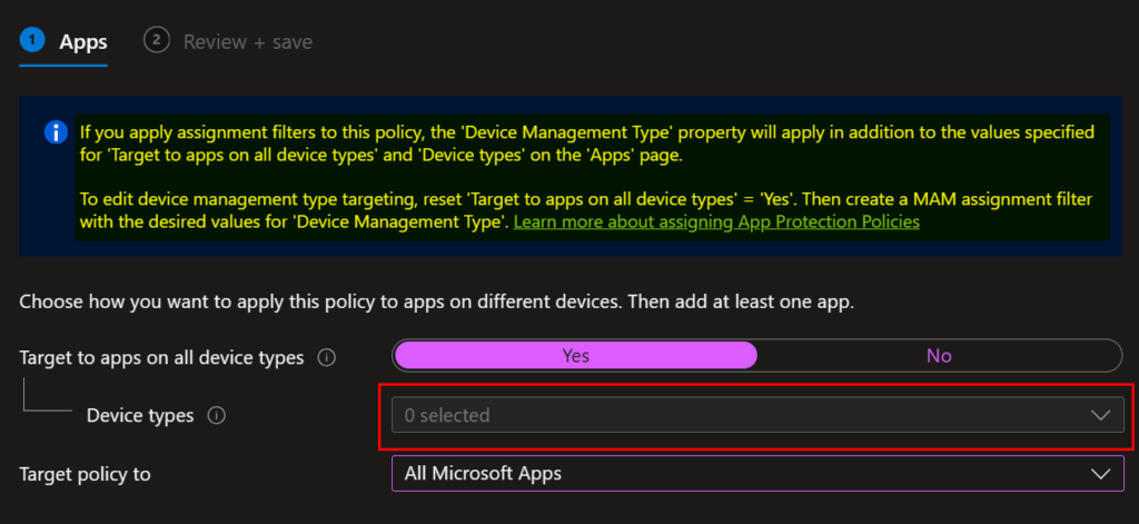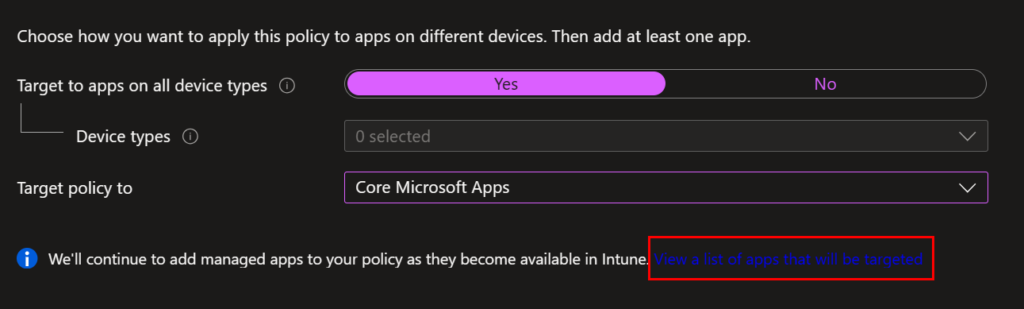 We can see a notification that’s basically telling us to make a filter. In my opinion. this notification and the link they provide just make things more confusing. What this is telling us is that you need to select “yes” for Target to all on all device types (even if you select No, the device types drop-down remains greyed out). This means that regardless of the device management type (managed/unmanaged), the app protection policy will apply. To ONLY target our unmanaged devices, we need to use ap app filter for devices. We will get there later, for now, let’s continue with our policy creation. Before continuing, select which apps you want to target your policy against. In most situations, selecting all Microsoft Apps or Core Microsoft apps is sufficient. If you’re unsure of the difference between the selections, make a selection and then click the link to “View a list of apps that will be targeted”. Continue after making a selection.