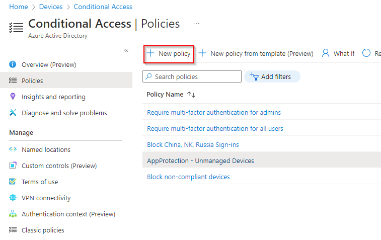 From Intune, Navigate to Devices > Conditional Access, and click New Policy: