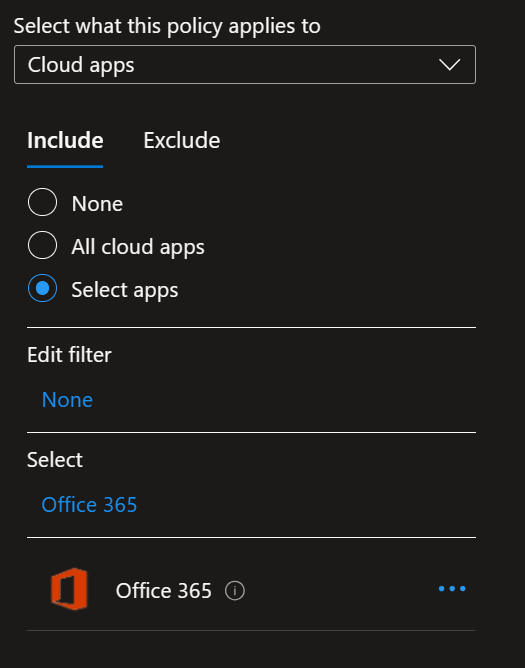 Next, select Office 365 from the cloud apps or actions tab. A list of the apps included in the Office 365 selection can be found here – Office 365 App in Conditional Access reference – Microsoft Entra ID | Microsoft Learn.