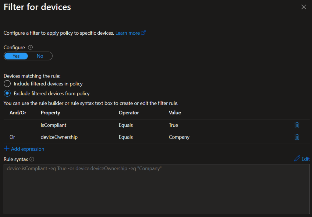 We also need to filter for devices since we only want to target unmanaged devices. Under conditions > filter for devices, we want to exclude company-owned MDM devices. We’ll choose to exclude filtered devices from the policy. You can either exclude compliant devices or exclude those that have ownership of company: