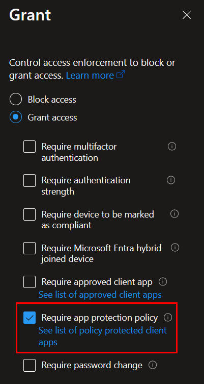 Under Access controls, configure grant access to require approved client app and require an app protection policy. For a list of client apps that support this setting, check this link.